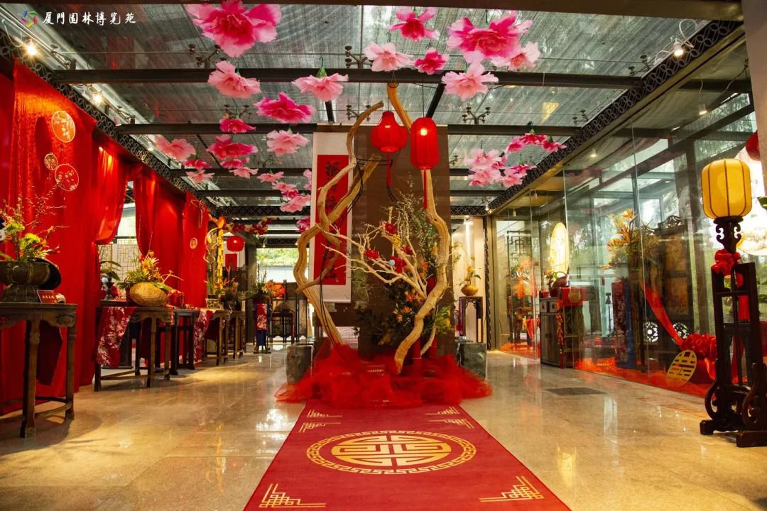 “新囍祝福”展廳以大紅為主色調,展示著古代婚禮“六禮”習俗,復原古時新人“跨火盆”“拜天地”“拜高堂”等喜慶場景,將古老的婚慶嫁娶器具與傳統(tǒng)插花相結合。“宴”展廳則以婚宴的插花為主進行布置,大體量大面積的花與裝置藝術的結合,極具婚宴花藝的震撼感。