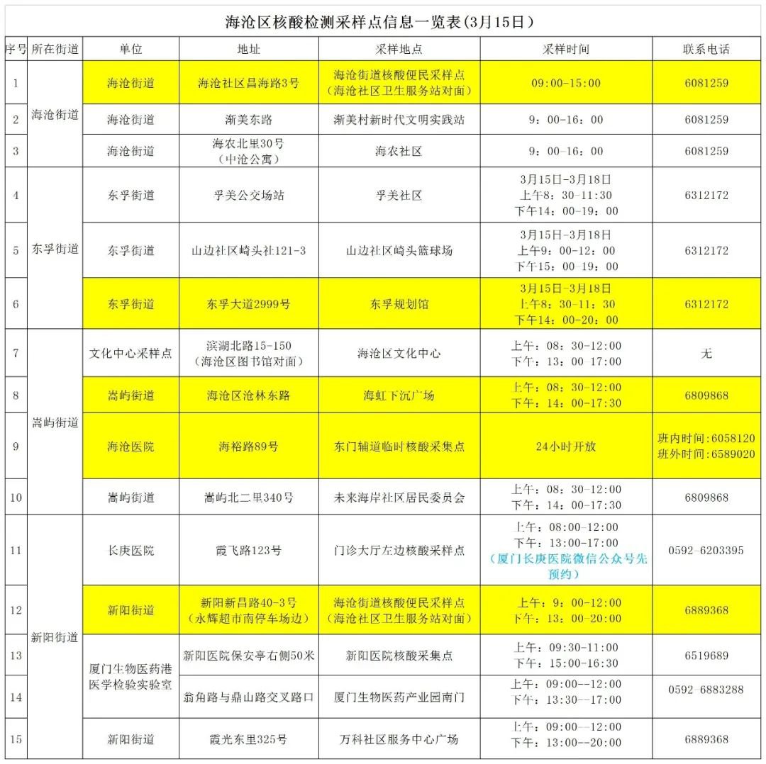 海滄區(qū)健康碼黃碼人員核酸檢測地點+電話