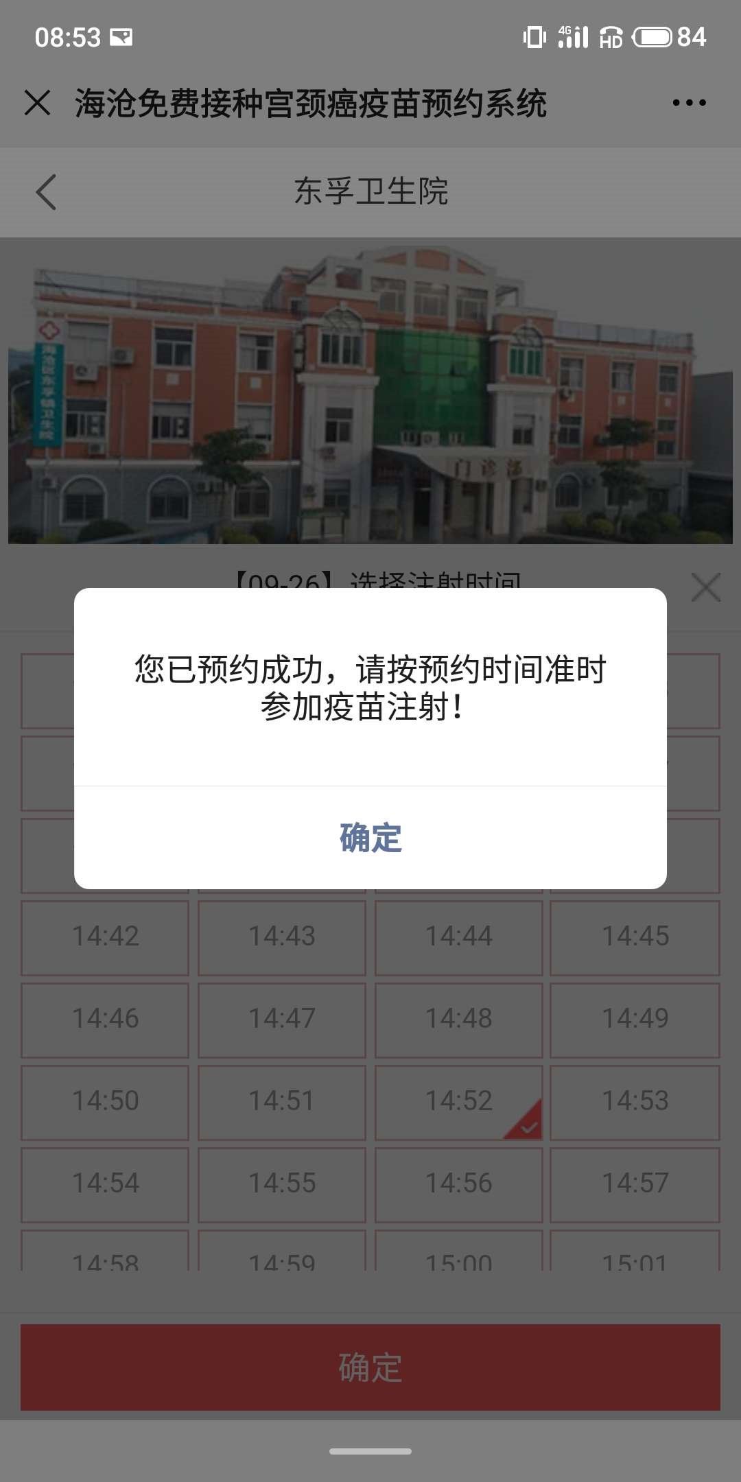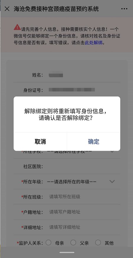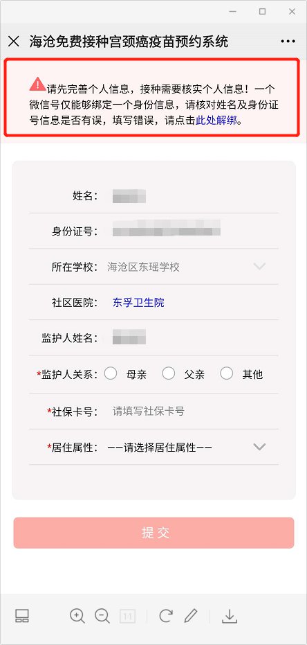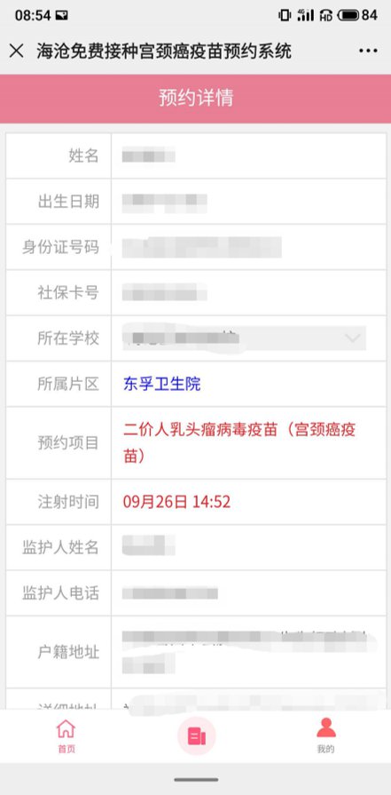 進入今日海滄公眾號,點擊“政務辦事”——“宮頸癌疫苗”,按平臺提示操作,再選擇女生學校所屬社區(qū)衛(wèi)生服務中心進行實名填寫和預約。預約成功后請務必按規(guī)定時間前往預約點進行接種。