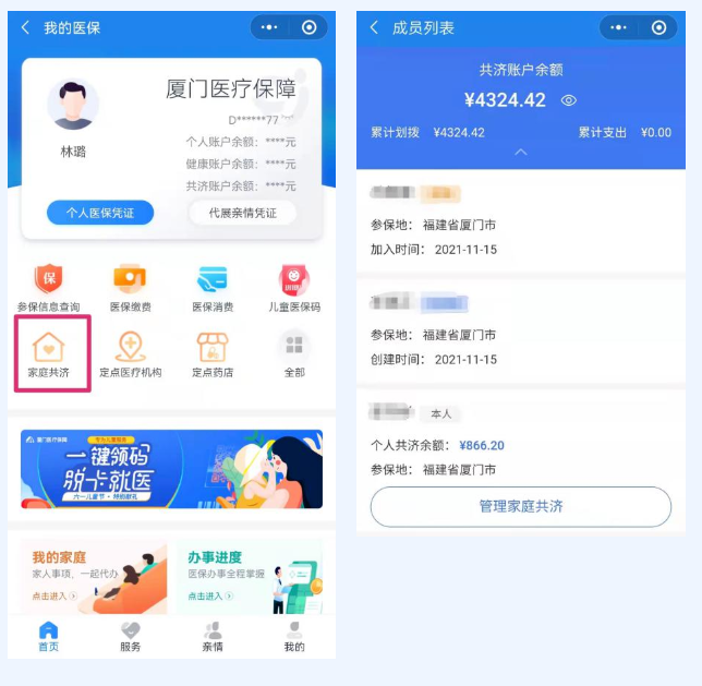 2.點擊“家庭共濟”模塊,可詳細查看共濟關系和共濟賬戶余額。