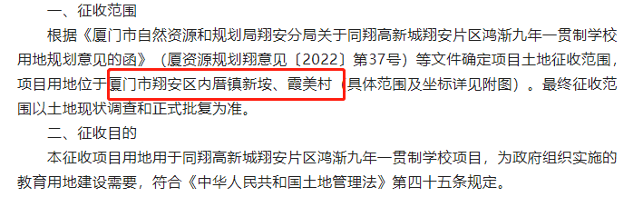 從中可知,項目用地位于廈門市翔安區(qū)內(nèi)厝鎮(zhèn)新垵、霞美村(具體范圍及坐標詳見附圖)。最終征收范圍以土地現(xiàn)狀調(diào)查和正式批復為準。