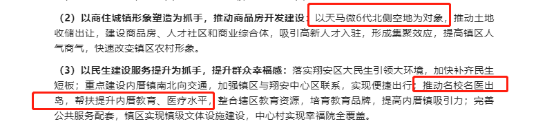 除此之外,文中還指出,要以天馬微6代北側(cè)空地為對象,推動土地收儲出讓;推動名校名醫(yī)出島,幫扶提升內(nèi)厝教育、醫(yī)療水平,整合轄區(qū)教育資源,培育教育品牌,提高內(nèi)厝鎮(zhèn)吸引力……