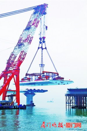 今天上午11時,翔安大橋(廈門第二東通道)A3標(biāo)海中段最后一榀鋼箱梁開始吊裝,翔安側(cè)海中橋梁與陸地主線橋在鷺島之濱上演“海陸之吻”。整個吊裝至下午2時許完成,翔安大橋翔安側(cè)預(yù)制構(gòu)件安裝作業(yè)全部結(jié)束,為全線明年春節(jié)前建成通車創(chuàng)造良好條件。