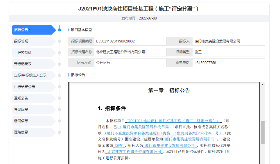 近日,J2021P01 地塊商住項(xiàng)目樁基工程(施工“評(píng)定分離”)招標(biāo)公告發(fā)布。