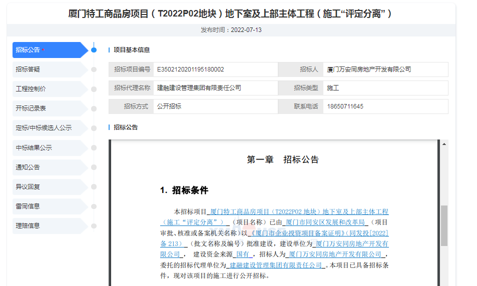 近日,廈門特工商品房項(xiàng)目(T2022P02地塊)地下室及上部主體工程(施工“評(píng)定分離”)招標(biāo)公告發(fā)布。