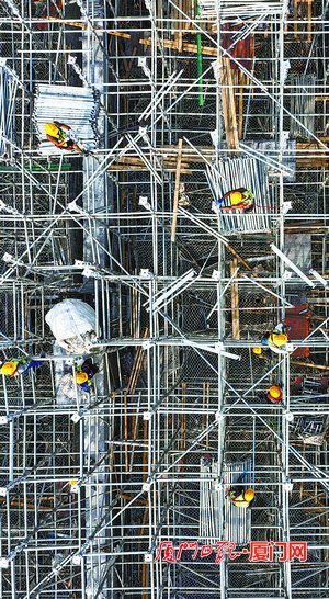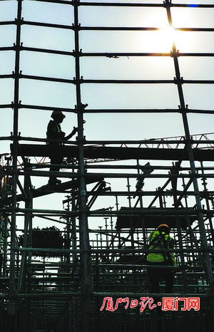 工人在輔房頂層加固鋼管。(本組圖/廈門日?qǐng)?bào)記者 王火炎 攝)