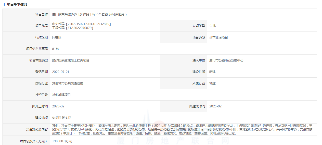 剛剛,廈門跨東海域通道北延伸段工程(圣巖路-環(huán)城南路段)報建信息公布。