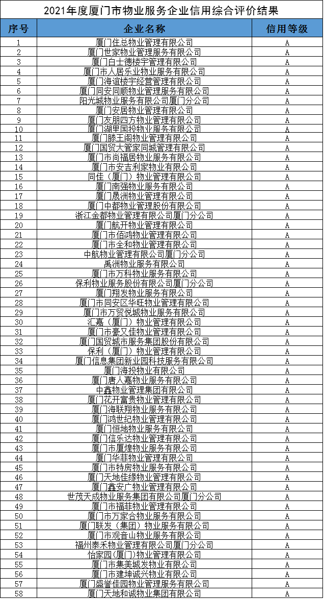58家物業(yè)服務(wù)企業(yè)信用評(píng)價(jià)結(jié)果為A級(jí);