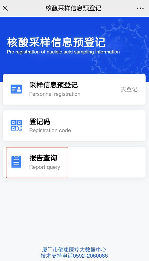 識別核酸預登記碼(如下所示),點擊報告查詢,即可查看核酸檢測結果。