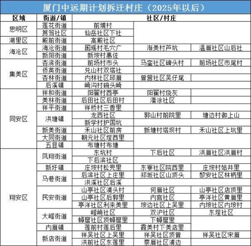 另,根據(jù)市自然規(guī)劃局近一個(gè)月的官方回復(fù),廈門近三年計(jì)劃拆遷和中遠(yuǎn)期計(jì)劃拆遷的村莊如下: