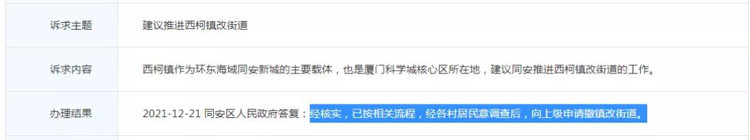 針對(duì)網(wǎng)友提出的建議,同安區(qū)人民政府隨后做出了相應(yīng)答復(fù):經(jīng)核實(shí),已按相關(guān)流程,經(jīng)各村居民意調(diào)查后,向上級(jí)申請(qǐng)撤鎮(zhèn)改街道。