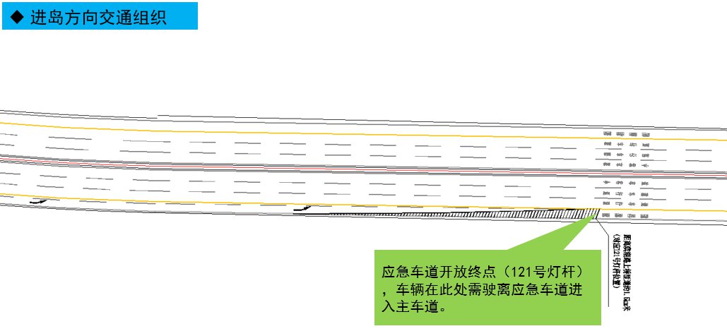 ? 通行區(qū)段:進(jìn)島方向57號(hào)燈桿至121號(hào)燈桿段(如圖示)