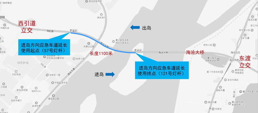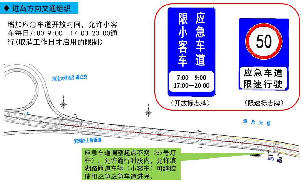 考慮海滄大橋非工作日交通流量的變化,決定增加應(yīng)急車道開(kāi)放時(shí)間,取消非工作日禁止通行應(yīng)急車道的限制,允許每日7:00-9:00;17:00-20:00通行,開(kāi)放區(qū)段、允許通行車型、限速不變。