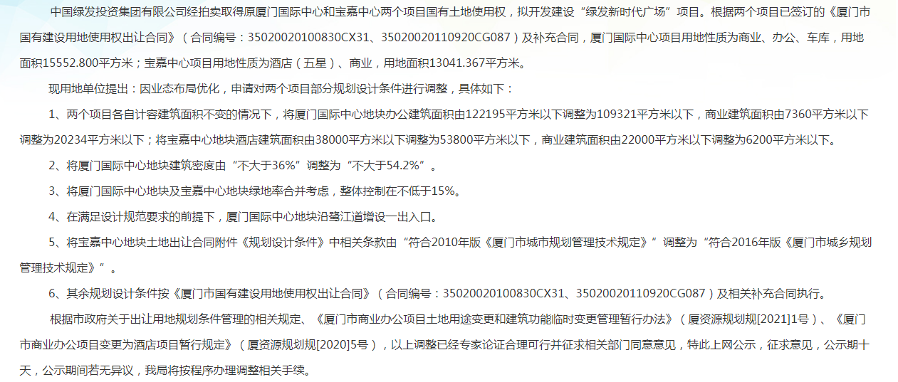 中國綠發(fā)投資集團有限公司經(jīng)拍賣取得原廈門國際中心和寶嘉中心兩個項目國有土地使用權,擬開發(fā)建設“綠發(fā)新時代廣場”項目。根據(jù)兩個項目已簽訂的《廈門市國有建設用地使用權出讓合同》(合同編號:35020020100830CX31、35020020110920CG087)及補充合同,廈門國際中心項目用地性質為商業(yè)、辦公、車庫,用地面積15552.800平方米;寶嘉中心項目用地性質為酒店(五星)、商業(yè),用地面積13041.367平方米。
