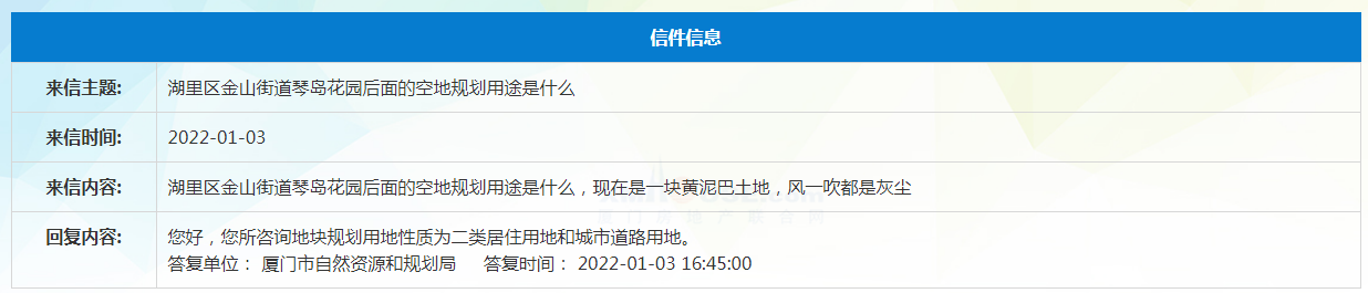 對此,廈門市自然資源和規(guī)劃局回復(fù):您所咨詢地塊規(guī)劃用地性質(zhì)為二類居住用地和城市道路用地。