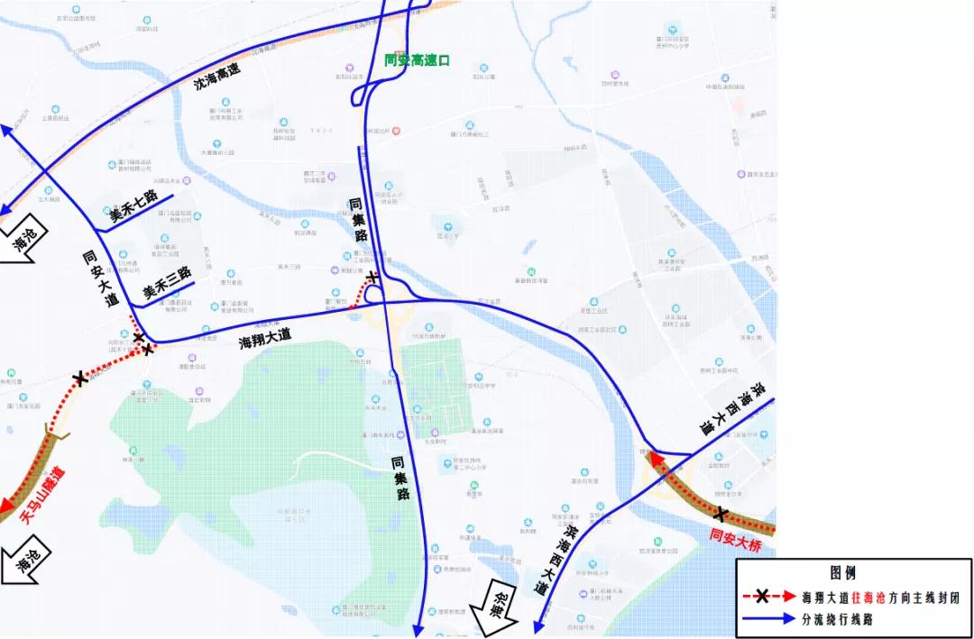 海翔大道西濱路立交至杏前路立交段、海翔大道杏錦路立交至集美大道立交段(含西亭隧道)和海翔大道天馬路口至同安大道立交段(含天馬山隧道)機動車實行由西往東單向行駛(由海滄往翔安方向),禁止機動車由東往西(由翔安往海滄方向)通行,上述立交范圍內(nèi)相關(guān)匝道同步封閉,受限機動車請繞行沈海高速、濱海西大道、同集路和新324國道等周邊道路。
