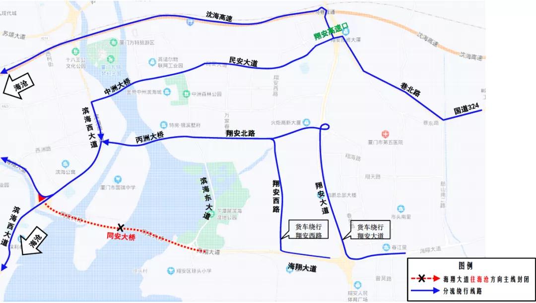 海翔大道濱海西大道立交至濱海東大道立交(含同安大橋)機動車實行由西往東單向行駛(由海滄往翔安方向),禁止機動車由東往西(由翔安往海滄方向)通行,立交范圍內(nèi)相關(guān)匝道同步封閉,受限機動車請繞行沈海高速、民安大道和翔安北路等周邊道路。