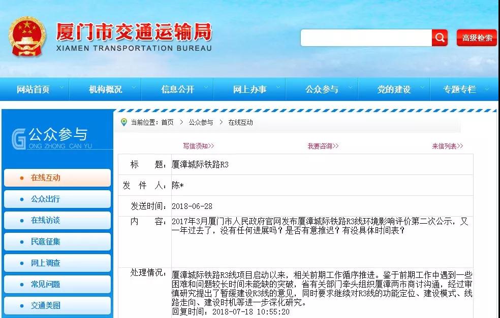 之后,同年的10月份,有網(wǎng)友在漳州市12345便民服務(wù)平臺(tái)提問:從漳州火車站經(jīng)龍海市到廈門的R3城際鐵路什么時(shí)候開始動(dòng)工建設(shè)?沿途會(huì)設(shè)立哪些站點(diǎn)?