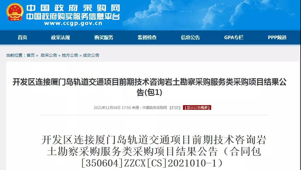 還記得去年11月,中國(guó)政府采購(gòu)網(wǎng)發(fā)布了《開發(fā)區(qū)連接廈門島軌道交通項(xiàng)目前期技術(shù)咨詢巖土勘察采購(gòu)服務(wù)類采購(gòu)項(xiàng)目結(jié)果公告(包1)》文件。