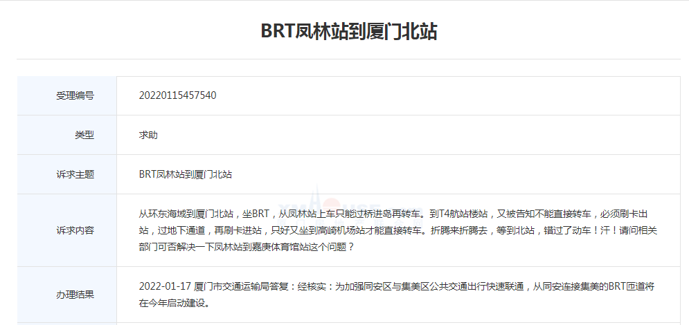 對(duì)此,廈門(mén)市交通運(yùn)輸局答復(fù):經(jīng)核實(shí):為加強(qiáng)同安區(qū)與集美區(qū)公共交通出行快速聯(lián)通,從同安連接集美的BRT匝道將在今年啟動(dòng)建設(shè)。
