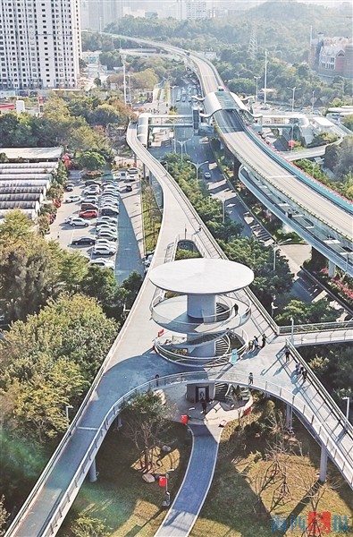 林海線遵循“以人為本”的設(shè)計理念,結(jié)合空中自行車道串聯(lián)沿線綠地、公園、商圈,全線合理控制縱坡,實現(xiàn)無障礙通行。沿途設(shè)置無障礙電梯8部,并配備驛站、公廁(含無障礙衛(wèi)生間)、休息平臺、便民服務(wù)點、健康小屋等配套服務(wù)設(shè)施,滿足老人、小孩、殘障人士等各類人群的使用需求。一期全線共設(shè)置36個出入口,其中23個為無障礙出入口,方便市民就近進入步道。