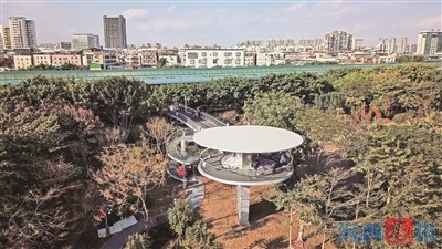 不遠處,一座人字形架空步道橋躍然湖畔,完美融匯了來自蔡塘BRT及湖邊水庫公園兩股人流。交匯處還新建了近20米高的圓形觀景平臺及螺旋梯(內(nèi)含1座垂直升降梯),打造成為湖邊水庫的節(jié)點公園(蓮湖臺)。設(shè)計人員介紹,蓮湖臺下方采用鳳凰木結(jié)合疏林大草坪的綠植手法,待夏季鳳凰花開時,從平臺俯瞰,火紅花海,生機勃勃,遠眺可賞湖邊水庫風(fēng)光,紅綠相交,水天一線,令人流連忘返。