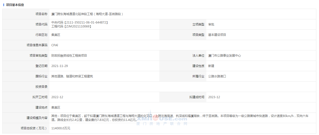 2021年11月底,廈門跨東海域通道北延伸段工程(海翔大道-圣巖路段)報建信息公布。
