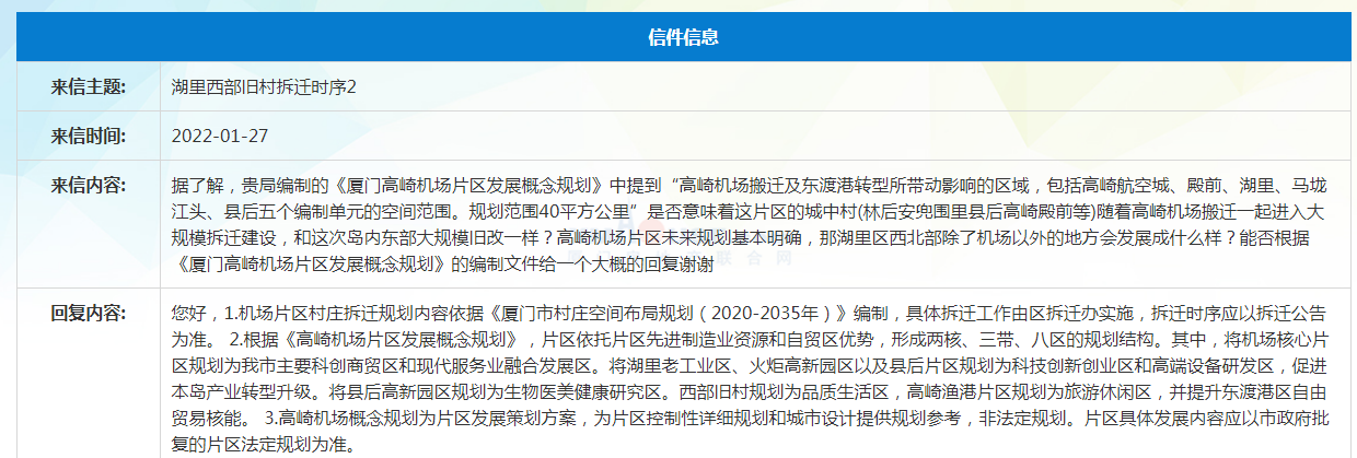 網(wǎng)友:據(jù)了解,貴局編制的《廈門高崎機(jī)場(chǎng)片區(qū)發(fā)展概念規(guī)劃》中提到“高崎機(jī)場(chǎng)搬遷及東渡港轉(zhuǎn)型所帶動(dòng)影響的區(qū)域,包括高崎航空城、殿前、湖里、馬垅江頭、縣后五個(gè)編制單元的空間范圍。規(guī)劃范圍40平方公里”是否意味著這片區(qū)的城中村(林后安兜圍里縣后高崎殿前等)隨著高崎機(jī)場(chǎng)搬遷一起進(jìn)入大規(guī)模拆遷建設(shè),和這次島內(nèi)東部大規(guī)模舊改一樣?高崎機(jī)場(chǎng)片區(qū)未來規(guī)劃基本明確,那湖里區(qū)西北部除了機(jī)場(chǎng)以外的地方會(huì)發(fā)展成什么樣?能否根據(jù)《廈門高崎機(jī)場(chǎng)片區(qū)發(fā)展概念規(guī)劃》的編制文件給一個(gè)大概的回復(fù)謝謝。