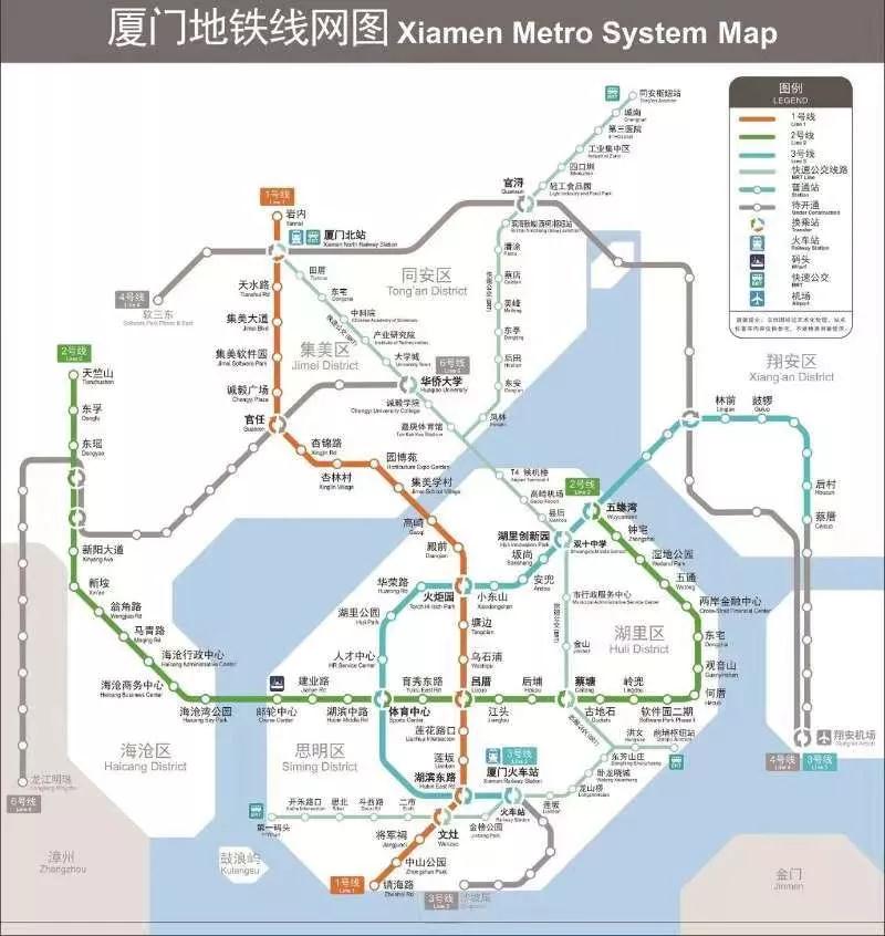 目前廈門已經(jīng)通車的地鐵有1、2、3號線,未來伴隨著新地鐵的“加入”,整個交通網(wǎng)將會形成放射狀的軌道交通骨架。