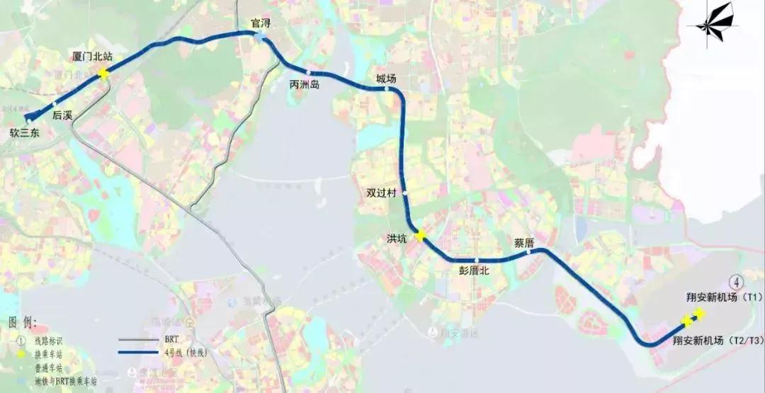 4號(hào)線(軟三東至翔安機(jī)場段):為快線(目標(biāo)值120km/h),長45公里,設(shè)站12座,2017年2月開工,除機(jī)場段外,已基本完成土建工程,正同步開展鋪軌施工,逐步轉(zhuǎn)入機(jī)電施工,計(jì)劃翔安機(jī)場通航前半年(2026年6月)建成。