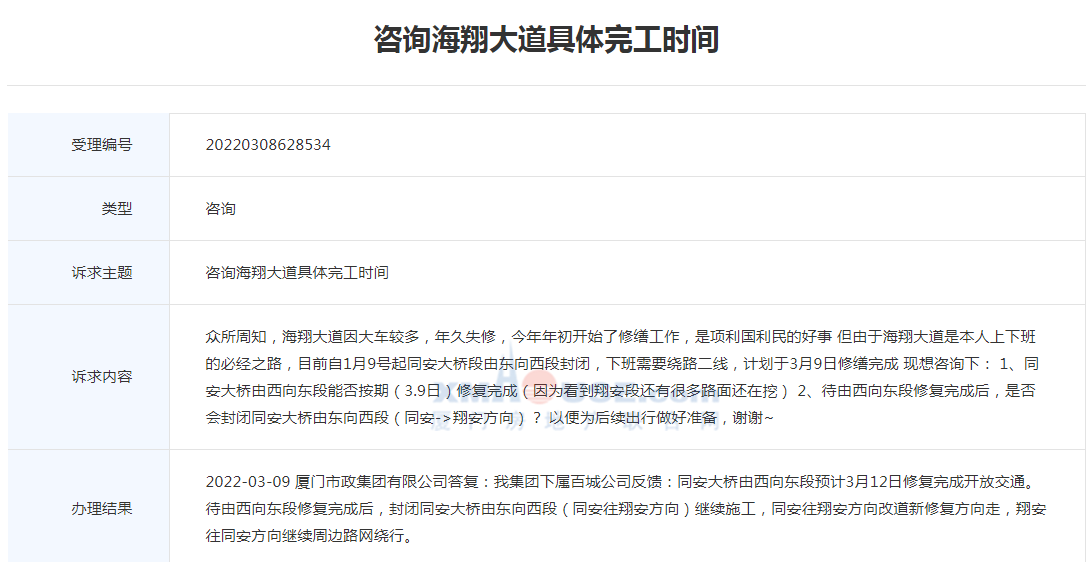 網(wǎng)友:眾所周知,海翔大道因大車較多,年久失修,今年年初開始了修繕工作,是項(xiàng)利國利民的好事 但由于海翔大道是本人上下班的必經(jīng)之路,目前自1月9號起同安大橋段由東向西段封閉,下班需要繞路二線,計(jì)劃于3月9日修繕完成 現(xiàn)想咨詢下: 1、同安大橋由西向東段能否按期(3.9日)修復(fù)完成(因?yàn)榭吹较璋捕芜€有很多路面還在挖) 2、待由西向東段修復(fù)完成后,是否會封閉同安大橋由東向西段(同安-》翔安方向)? 以便為后續(xù)出行做好準(zhǔn)備,謝謝~