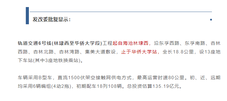 就6號(hào)線(林埭西站至華僑大學(xué)站段)工程而言,根據(jù)之前市發(fā)改委發(fā)布關(guān)于軌道交通6號(hào)線(林埭西至華僑大學(xué)段)工程可行性研究報(bào)告的批復(fù)可知,工程2019年12月31日開(kāi)工,計(jì)劃竣工日期,2023年8月31日。總投資估算135.19億元。
