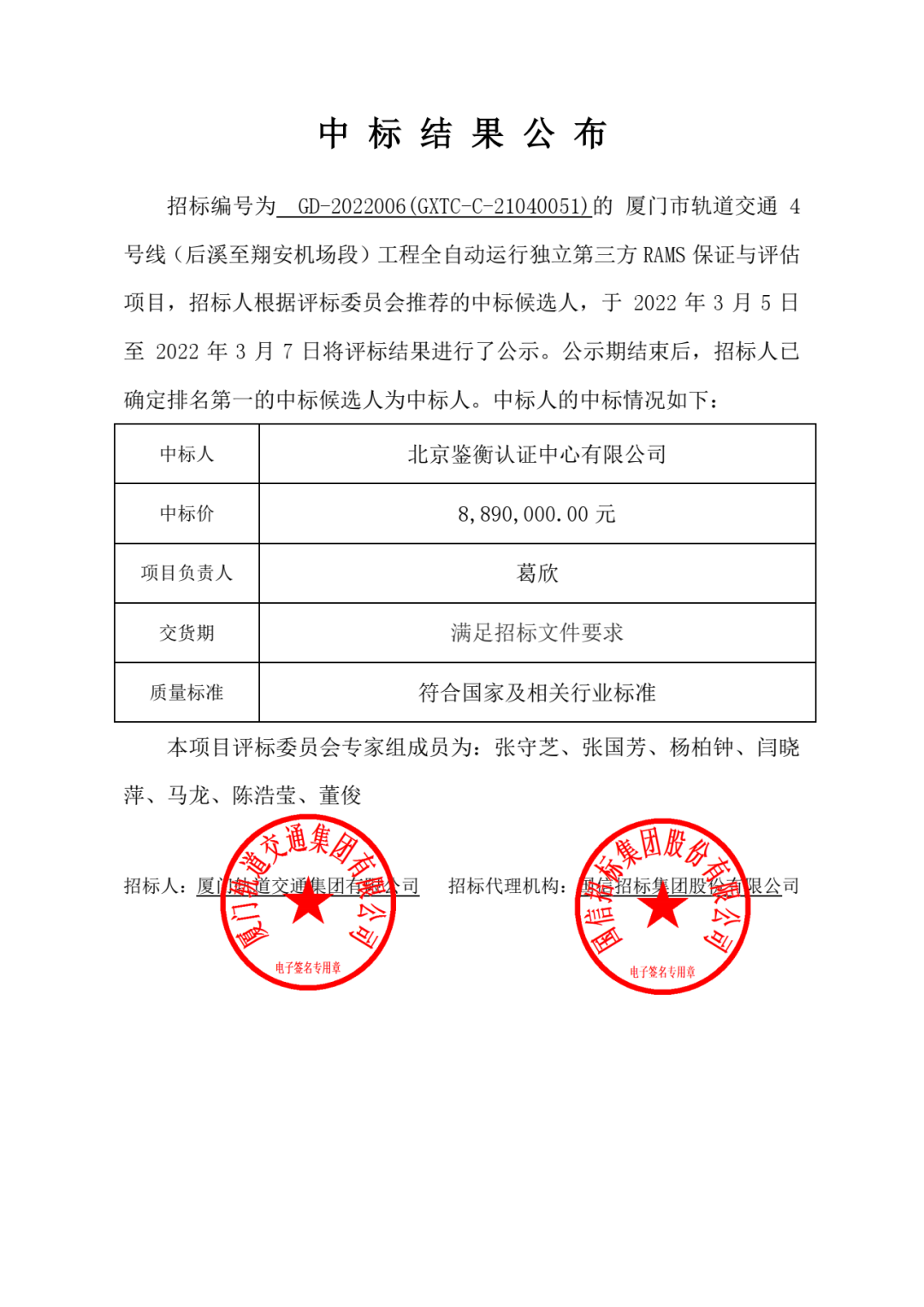 近日,地鐵4號線傳來新動態(tài)——廈門市軌道交通4號線(后溪至翔安機場段)工程全自動運行獨立第三方RAMS保證與評估項目中標結果出爐,中標人為北京鑒衡認證中心有限公司。