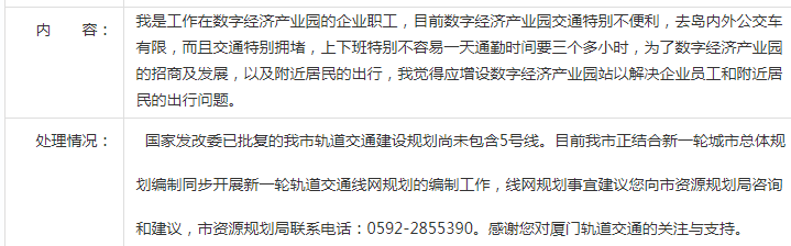 近日,有網(wǎng)友在官方平臺反饋:他是工作在數(shù)字經(jīng)濟產(chǎn)業(yè)園的企業(yè)職工,目前數(shù)字經(jīng)濟產(chǎn)業(yè)園交通特別不便利,去島內外公交車有限,而且交通特別擁堵,上下班特別不容易一天通勤時間要三個多小時,為了數(shù)字經(jīng)濟產(chǎn)業(yè)園的招商及發(fā)展,以及附近居民的出行,他覺得應增設數(shù)字經(jīng)濟產(chǎn)業(yè)園站以解決企業(yè)員工和附近居民的出行問題。