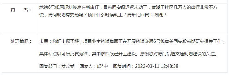 他提及地鐵6號線原規(guī)劃終點在新店仔,目前同安段遲遲未動工,香溪里社區(qū)幾萬人的出行非常不方便,請問規(guī)劃有變動嗎?預計什么時候動工?