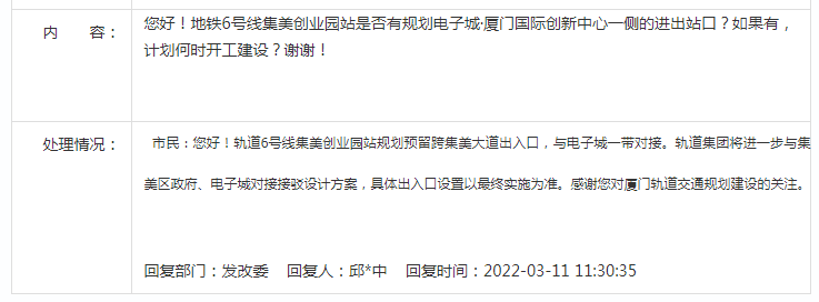 此外,還有網(wǎng)友詢問:地鐵6號線集美創(chuàng)業(yè)園站是否有規(guī)劃電子城·廈門國際創(chuàng)新中心一側的進出站口?如果有,計劃何時開工建設?