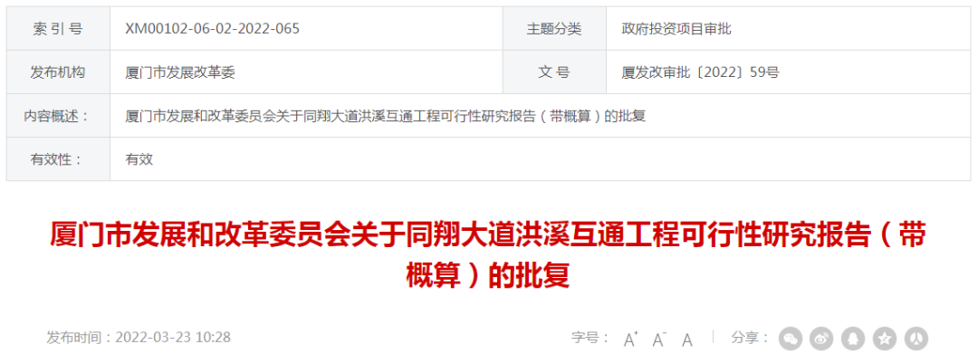 近日,廈門市發(fā)展和改革委員會批復(fù)關(guān)于同翔大道洪溪互通工程可行性研究報告,總投資概算82049萬元(不含另估征地拆遷費(fèi)、管線遷改費(fèi)和土地使用成本)。