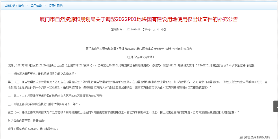 值得一提的是,在3月25日,廈門(mén)市自然資源和規(guī)劃局發(fā)布了關(guān)于調(diào)整2022P01地塊國(guó)有建設(shè)用地使用權(quán)出讓文件的補(bǔ)充公告。