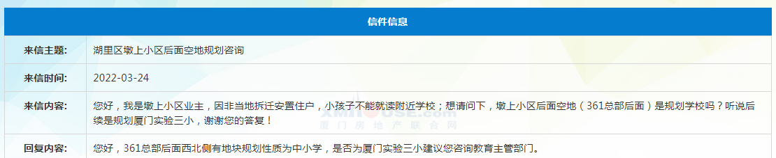 對此,廈門市自然資源和規(guī)劃局回復(fù):您好,361總部后面西北側(cè)有地塊規(guī)劃性質(zhì)為中小學(xué),是否為廈門實驗三小建議您咨詢教育主管部門。