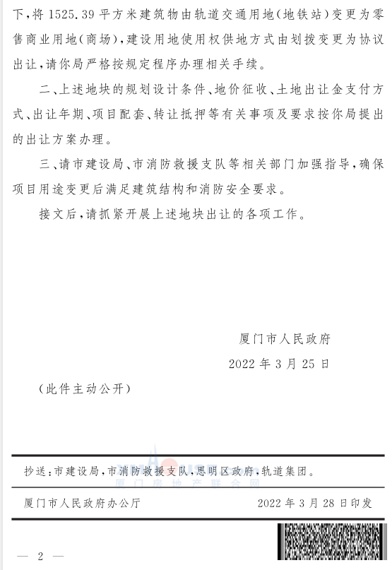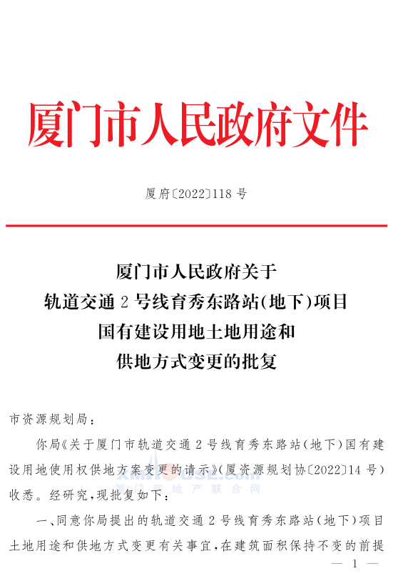 近日, 廈門市人民政府發(fā)布關(guān)于軌道交通2號(hào)線育秀東路站(地下)項(xiàng)目國(guó)有建設(shè)用地土地用途和供地方式變更的批復(fù),同意軌道交通2號(hào)線育秀東路站(地下)項(xiàng)目土地用途和供地方式變更有關(guān)事宜,在建筑面積保持不變的前提下,將1525.39平方米建筑物由軌道交通用地(地鐵站)變更為零售商業(yè)用地(商場(chǎng)),建設(shè)用地使用權(quán)供地方式由劃撥變更為協(xié)議出讓,請(qǐng)嚴(yán)格按規(guī)定程序辦理相關(guān)手續(xù)。