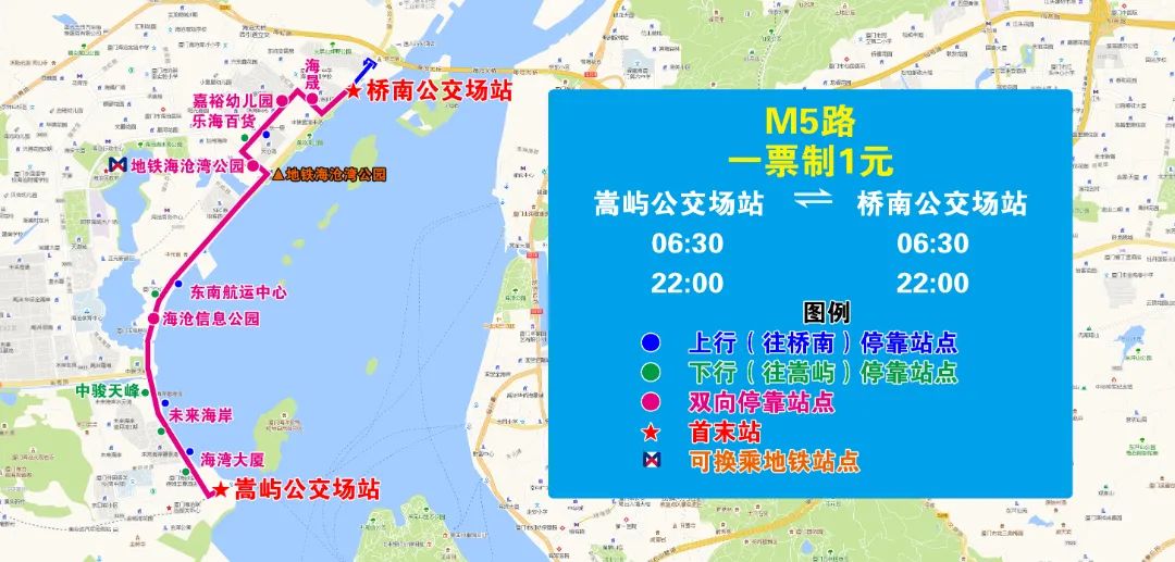 五、新增M5路,方便嵩嶼生活區(qū)、廈門中心大廈、橋南生活區(qū)乘客接駁地鐵海滄灣公園站