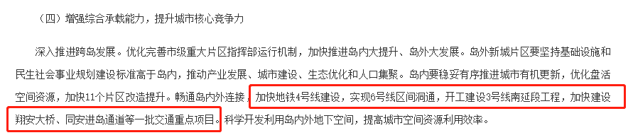 2022年是實施“十四五”規(guī)劃承上啟下的關(guān)鍵一年,廈門將重點做好十個方面工作,其中有一點指出,暢通島內(nèi)外連接,加快地鐵4號線建設(shè),實現(xiàn)6號線區(qū)間洞通,開工建設(shè)3號線南延段工程,加快建設(shè)翔安大橋、同安進島通道等一批交通重點項目。