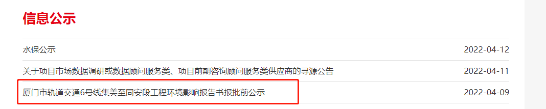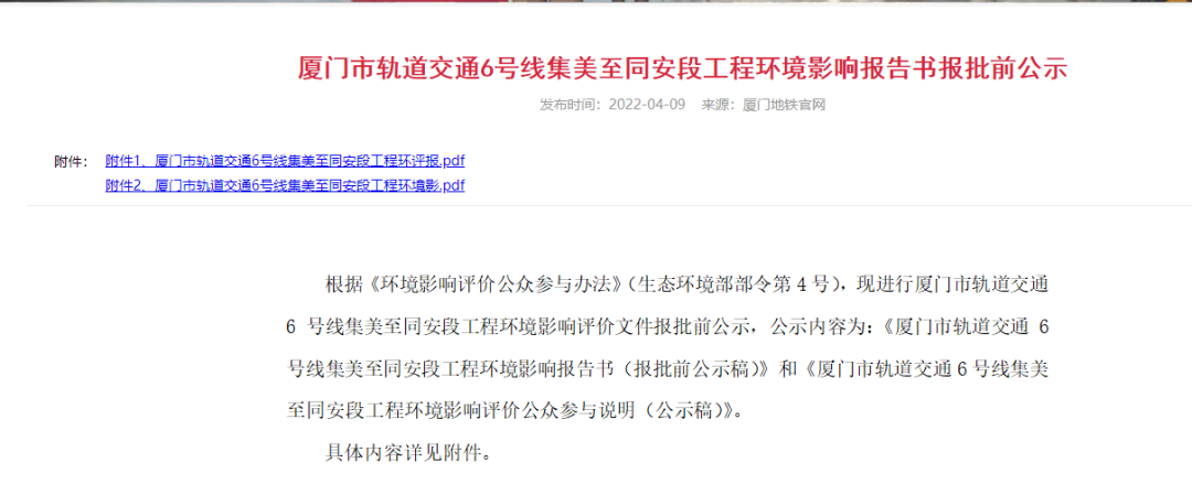 值得一提的是,日前,廈門市軌道交通6號線集美至同安段工程環(huán)境影響評價文件,在廈門地鐵官網(wǎng)進行報批前公示。