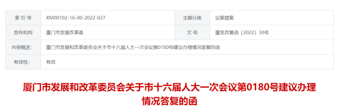 對此,廈門市發(fā)展和改革委員會也于日前發(fā)布了關(guān)于市十六屆人大一次會議第0180號建議辦理情況答復的函。