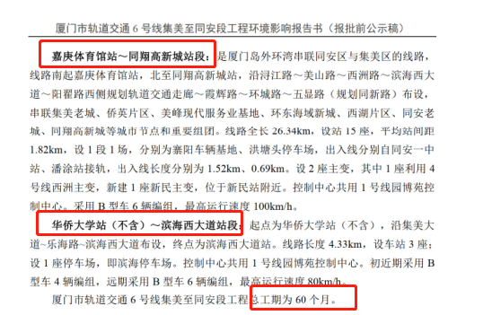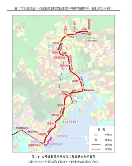 根據(jù)《廈門市軌道交通6號線集美至同安段工程環(huán)境影響報告書》(報批前公示稿件),廈門市軌道交通6號線集美至同安段工程,包含兩個區(qū)段,嘉庚體育館站至同翔高新城站段和華僑大學站(不含)至濱海西大道站段。