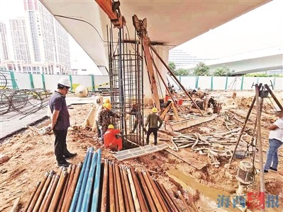 施工人員向新建橋樁樁孔內(nèi)放置鋼筋籠。