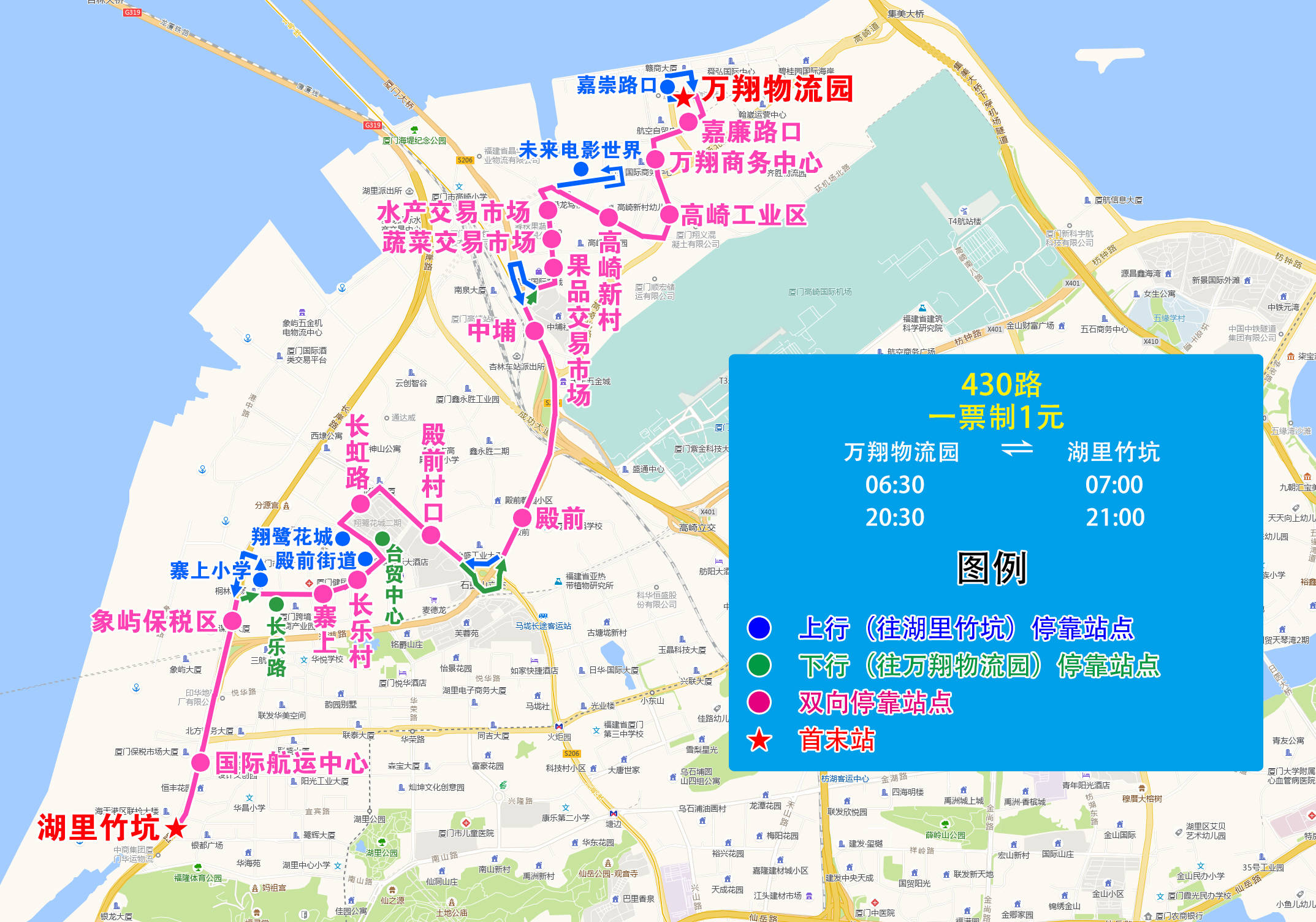 下行:湖里竹坑始發(fā),行至高崎北路港中路口,改經(jīng)港中路、嘉廉路、赤山坪路至萬翔物流園。