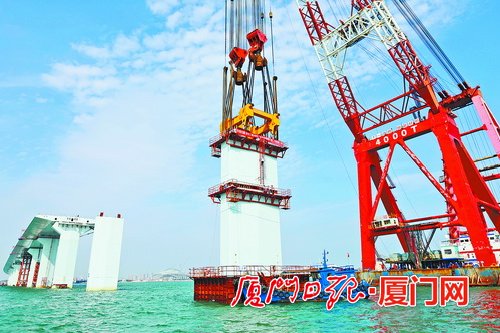 昨日,翔安大橋完成吊裝的H11號(hào)墩中節(jié)墩臺(tái)約150立方米,重達(dá)387噸。(廈門日?qǐng)?bào)記者 王協(xié)云 攝)
