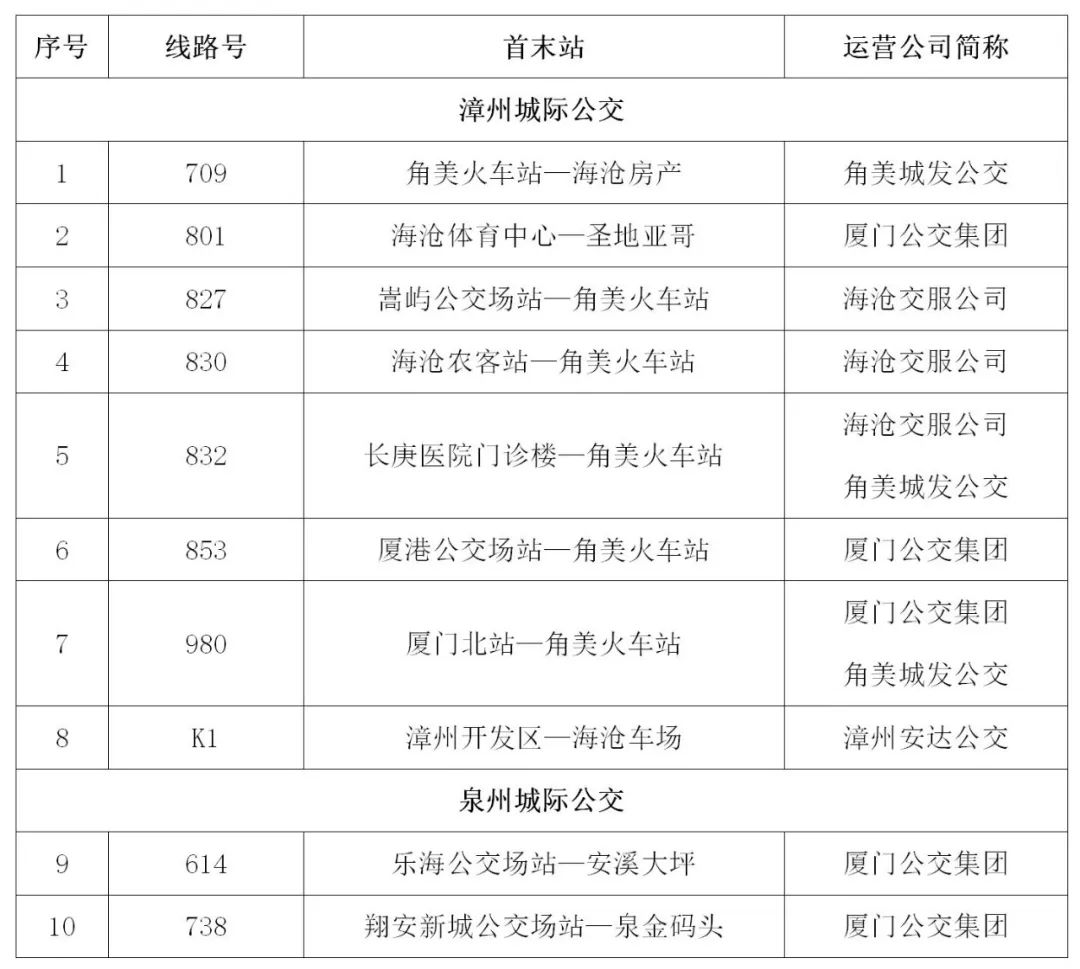 738路開通后,廈門市共有10條城際公交線路,其中漳州往返廈門8條,泉州往返廈門2條,具體情況詳見下表。