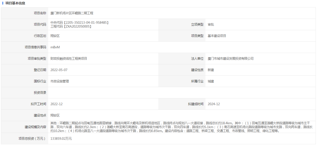 5月7日,廈門新機(jī)場片區(qū)環(huán)嶝路二期工程報(bào)建信息公布,項(xiàng)目位于機(jī)場片區(qū),總投133859.02萬元,項(xiàng)目擬開工時間為2022年12月,擬建成時間為2024年12月。